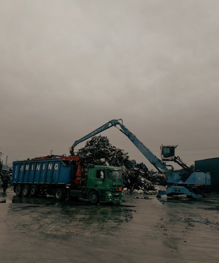 A sturdy dump truck loaded with materials driving through a dusty industrial zone.